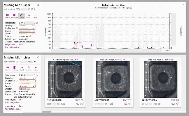 As soon as the first 30 units from the build were available in the application, Motorola engineers could use Instrumental’s machine-learning algorithms to quickly and efficiently find new defects that they weren’t previously aware of. Instead of standing on the assembly line for hours, moving amongst a hundred assembly steps trying to be in the right place at the right time to identify something new, engineers could do a search of all of the units in seconds. Once a defect was found, with a few clicks, an engineer could setup an enduring Monitor, or test, that would check every subsequent unit for the same failure mode, and automatically sort the failures into neat collections where defect rates and trends are calculated in real-time.