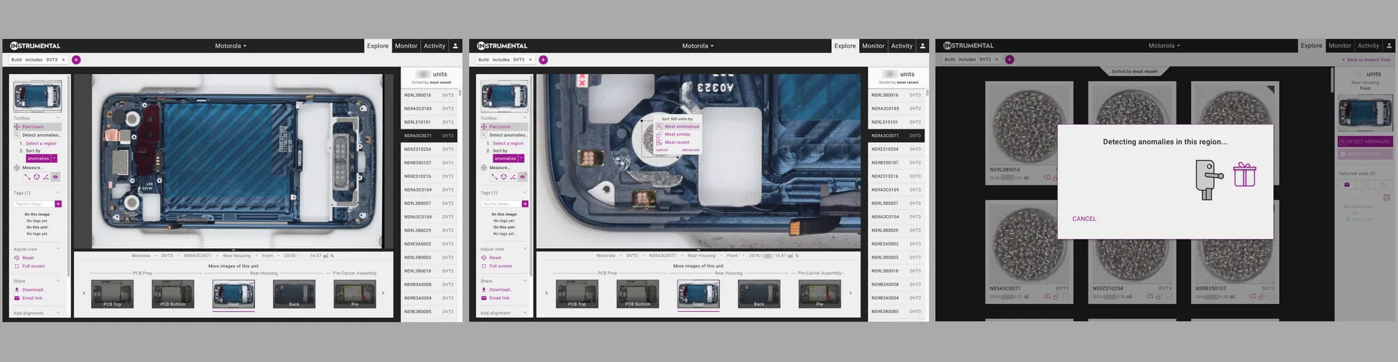 On the first day of the DVT build, the Instrumental stations collected images of each unit running down the line. These images covered both sides of the PCB assembly, the bare enclosure, two stages of building into the enclosure, and many images of the exterior of the finished product. As soon as these images were collected, they were uploaded to Instrumental’s database, and immediately available in the Instrumental web application to Motorola engineers around the world. This complete data record is a key differentiator between Instrumental and traditional industrial vision systems, where the applications must be incredibly specific and the data remains trapped on the local machine in the factory, unavailable to the team.